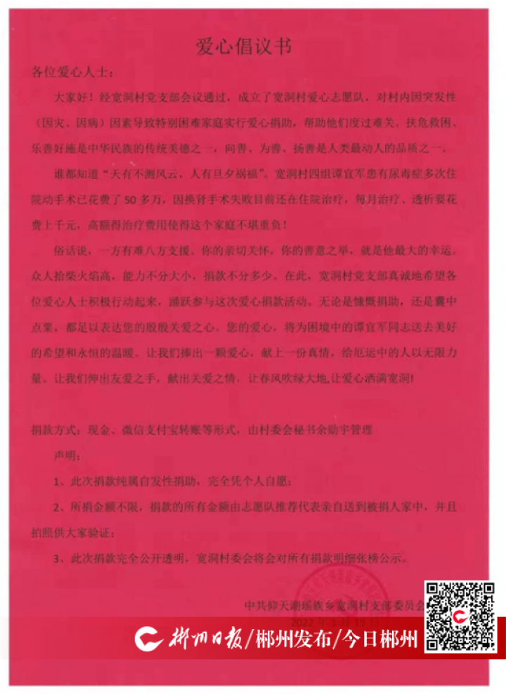 郴州日报·今日郴州客户端讯(通讯员 黄丽婷)春节前,为帮助村民谭宜军尽快脱离病魔,北湖区仰天湖瑶族乡宽洞村新时代文明实践站向全体村民发出捐款倡议,并通过微信群、朋友圈积极转发,号召大家为谭宜军治病捐款。