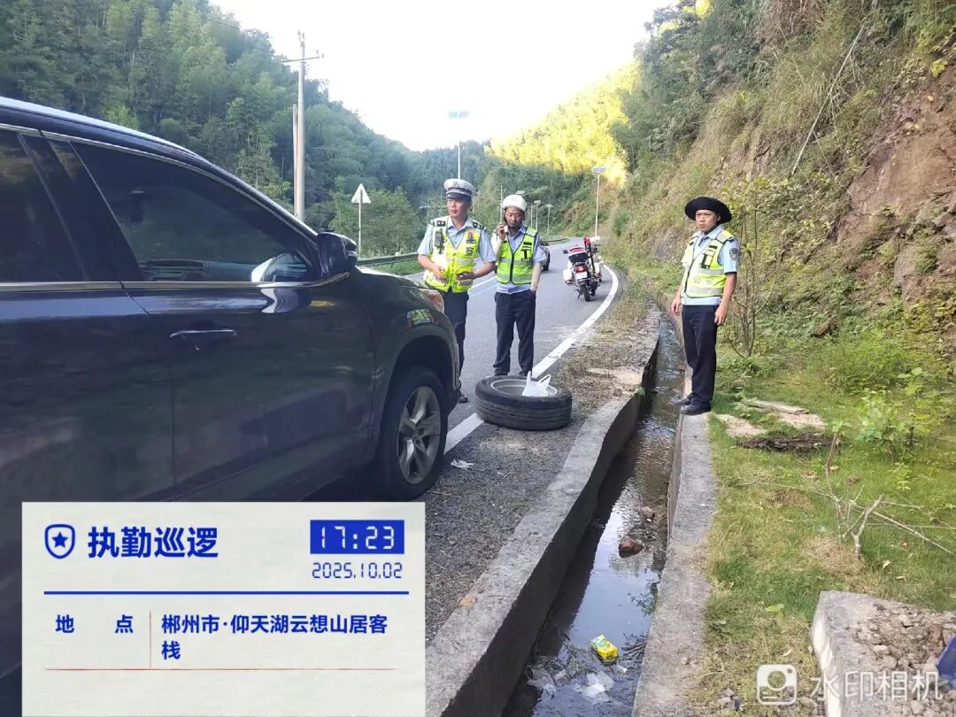 10月2日下午5时许,叶先生带着妻儿刚从仰天湖大草原景区游玩返回城区酒店,车辆行驶至郴仰公路小江口路段时,突然爆胎,让他顿时手足无措。“孩子又累又饿,在这前不着村后不着店的地方,真是急得满头大汗。”眼看暮色渐沉,叶先生面对陌生的环境和受损的车辆一筹莫展。